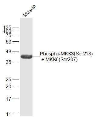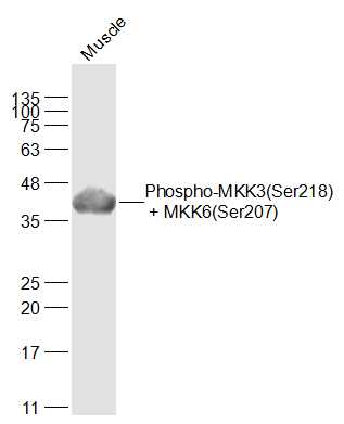 Primary: Anti-Phospho-MKK3(Ser218) + MKK6(Ser207) (bs-3274R) at 1/1000 dilution