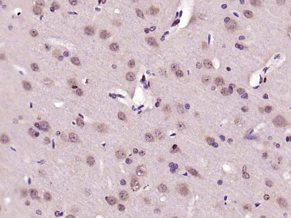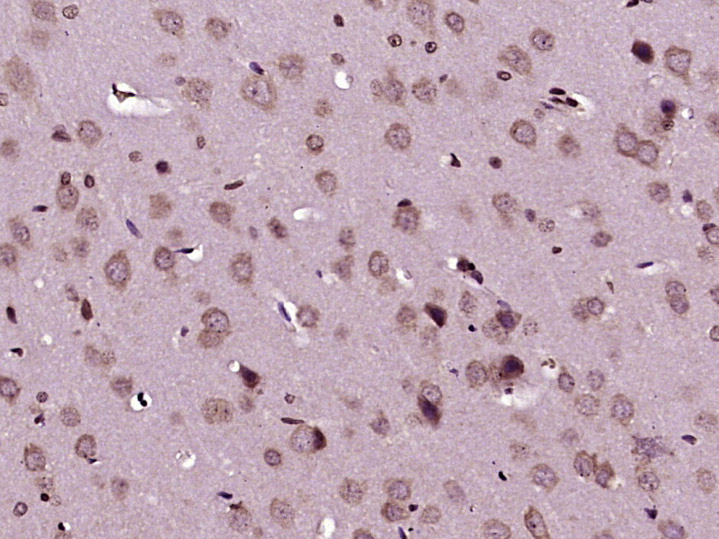 Paraformaldehyde-fixed, paraffin embedded (rat brain); Antigen retrieval by boiling in sodium citrate buffer (pH6.0) for 15min; Block endogenous peroxidase by 3% hydrogen peroxide for 20 minutes; Blocking buffer (normal goat serum) at 37°C for 30min; Antibody incubation with (Phospho-NFKB1 (Ser927)) Polyclonal Antibody, Unconjugated (bs-3300R) at 1:200 overnight at 4°C, followed by operating according to SP Kit(Rabbit) (sp-0023) instructionsand DAB staining.