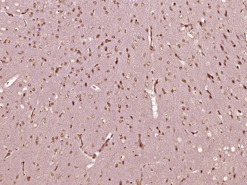 Paraformaldehyde-fixed, paraffin embedded (Rat brain); Antigen retrieval by boiling in sodium citrate buffer (pH6.0) for 15min; Block endogenous peroxidase by 3% hydrogen peroxide for 20 minutes; Blocking buffer (normal goat serum) at 37°C for 30min; Antibody incubation with (Nucleophosmin) Polyclonal Antibody, Unconjugated (bs-3508R) at 1:400 overnight at 4°C, followed by operating according to SP Kit(Rabbit) (sp-0023) instructionsand DAB staining.