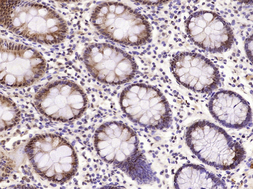 Paraformaldehyde-fixed, paraffin embedded (Human colon carcinoma); Antigen retrieval by microwave in sodium citrate buffer (pH6.0) ; Block endogenous peroxidase by 3% hydrogen peroxide for 30 minutes; Blocking buffer (3% BSA) at RT for 30min; Antibody incubation with (Phospho-PKR (Thr451)) Polyclonal /Monoclonal Antibody, Unconjugated (bs-3336R) at 1:400 overnight at 4℃, followed by conjugation to the secondary antibody (labeled with HRP)and DAB staining.