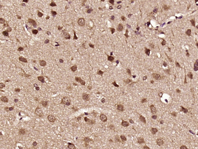 Paraformaldehyde-fixed, paraffin embedded (rat brain tissue); Antigen retrieval by boiling in sodium citrate buffer (pH6.0) for 15min; Block endogenous peroxidase by 3% hydrogen peroxide for 20 minutes; Blocking buffer (normal goat serum) at 37°C for 30min; Antibody incubation with (PYK2 (Tyr881)) Polyclonal Antibody, Unconjugated (bs-3401R) at 1:400 overnight at 4°C, followed by operating according to SP Kit(Rabbit) (sp-0023) instructionsand DAB staining.