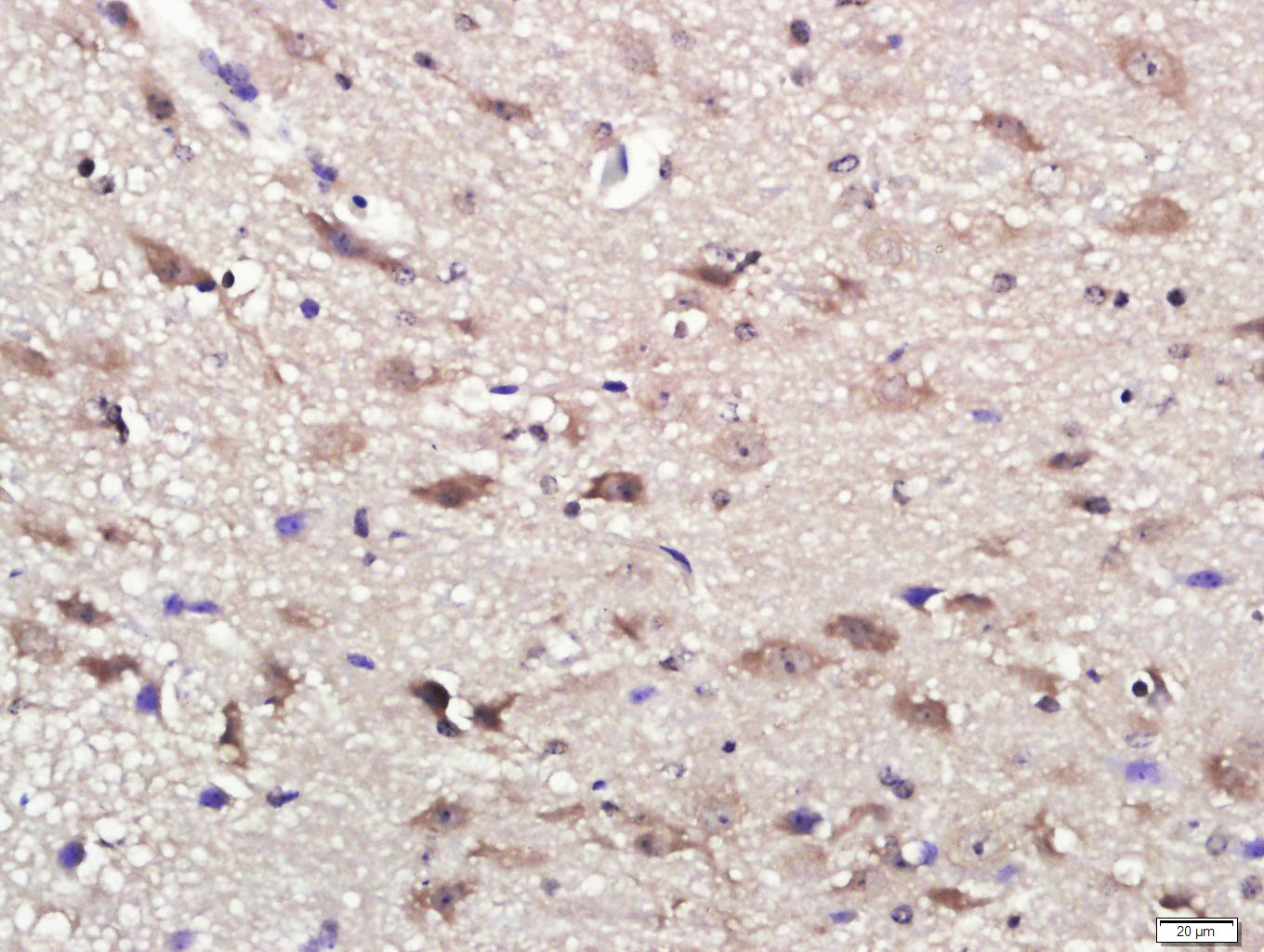 Paraformaldehyde-fixed, paraffin embedded (mouse brain); Antigen retrieval by boiling in sodium citrate buffer (pH6.0) for 15min; Block endogenous peroxidase by 3% hydrogen peroxide for 20 minutes; Blocking buffer (normal goat serum) at 37°C for 30min; Antibody incubation with (P-RPS6KA1 (Thr573)) Polyclonal Antibody, Unconjugated (bs-3364R) at 1:400 overnight at 4°C, followed by a conjugated secondary (sp-0023) for 20 minutes and DAB staining.