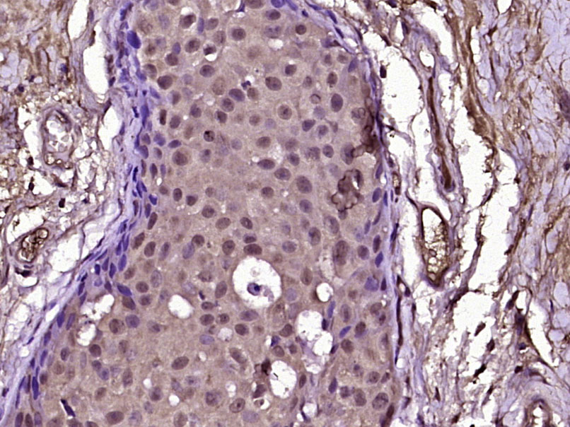 Paraformaldehyde-fixed, paraffin embedded (Human breast carcinoma); Antigen retrieval by boiling in sodium citrate buffer (pH6.0) for 15min; Block endogenous peroxidase by 3% hydrogen peroxide for 20 minutes; Blocking buffer (normal goat serum) at 37°C for 30min; Antibody incubation with (A Raf) Polyclonal Antibody, Unconjugated (bs-2251R) at 1:400 overnight at 4°C, followed by operating according to SP Kit(Rabbit) (sp-0023) instructionsand DAB staining.