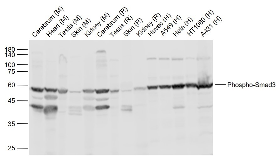 Primary: Anti-Phospho-Smad3 (Ser463 + Ser465) (bs-3418R) at 1/1000 dilution