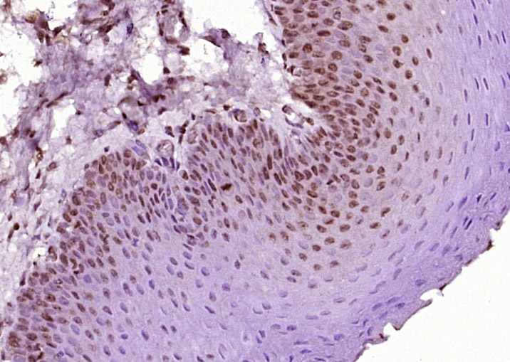 Paraformaldehyde-fixed, paraffin embedded (human laryngeal carcinoma); Antigen retrieval by boiling in sodium citrate buffer (pH6.0) for 15min; Block endogenous peroxidase by 3% hydrogen peroxide for 20 minutes; Blocking buffer (normal goat serum) at 37°C for 30min; Antibody incubation with (Phospho-CDK2 (Thr160)) Polyclonal Antibody, Unconjugated (bs-3483R ) at 1:200 overnight at 4°C, followed by operating according to SP Kit(Rabbit) (sp-0023) instructionsand DAB staining.