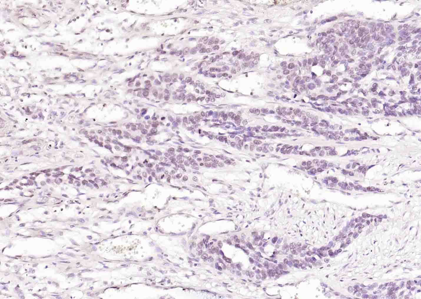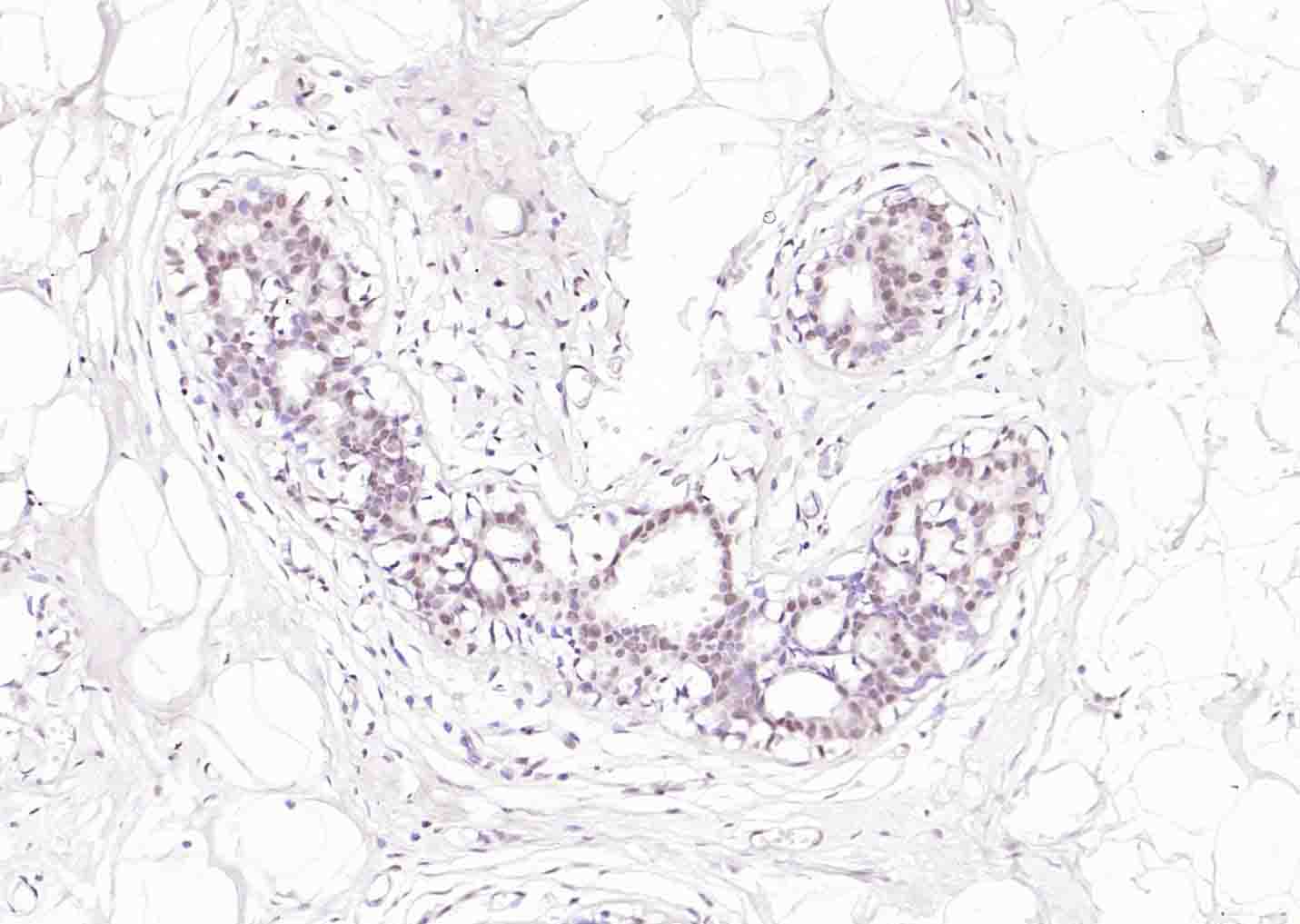 Paraformaldehyde-fixed, paraffin embedded (Human mammary gland); Antigen retrieval by boiling in sodium citrate buffer (pH6.0) for 15min; Block endogenous peroxidase by 3% hydrogen peroxide for 20 minutes; Blocking buffer (normal goat serum) at 37°C for 30min; Antibody incubation with (Phospho-p63 (Ser455) ) Polyclonal Antibody, Unconjugated (bs-3715R) at 1:200 overnight at 4°C, followed by operating according to SP Kit(Rabbit) (sp-0023) instructionsand DAB staining.