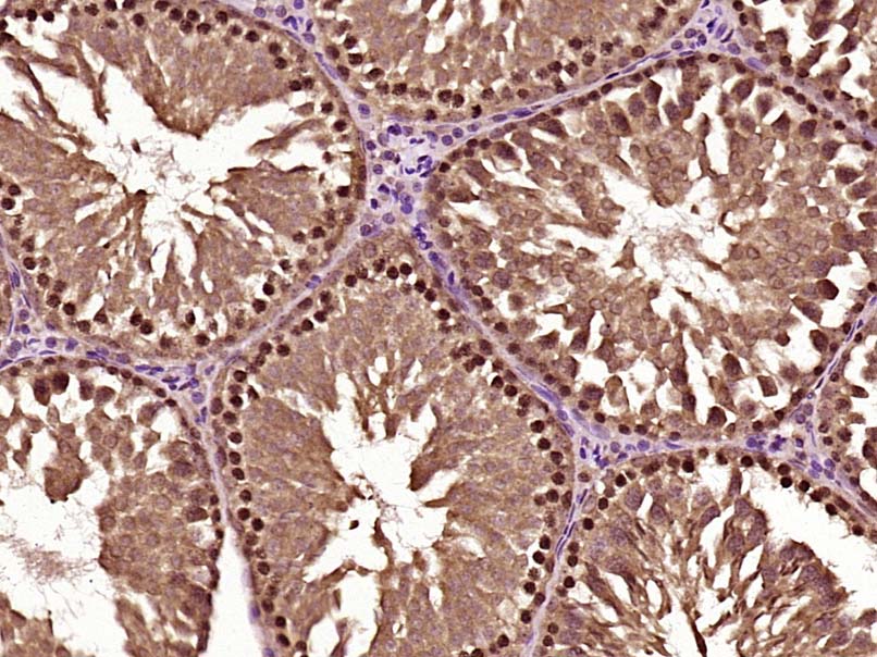 Paraformaldehyde-fixed, paraffin embedded (Rat testis); Antigen retrieval by boiling in sodium citrate buffer (pH6.0) for 15min; Block endogenous peroxidase by 3% hydrogen peroxide for 20 minutes; Blocking buffer (normal goat serum) at 37°C for 30min; Antibody incubation with (Phospho-CHK2 (Thr68)) Polyclonal Antibody, Unconjugated (bs-3721R) at 1:500 overnight at 4°C, followed by a conjugated secondary (sp-0023) for 20 minutes and DAB staining.