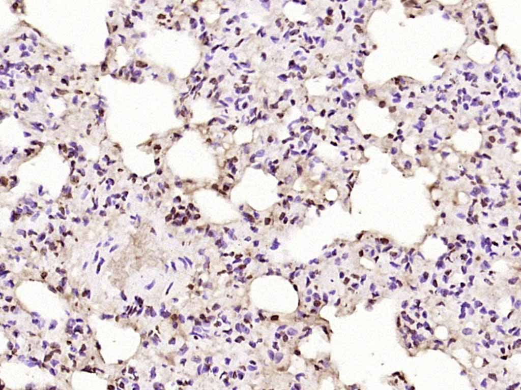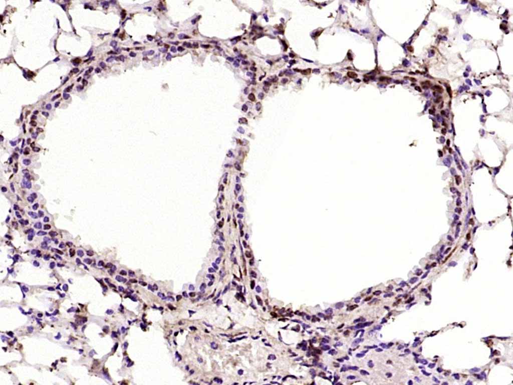 Paraformaldehyde-fixed, paraffin embedded (mouse lung); Antigen retrieval by boiling in sodium citrate buffer (pH6.0) for 15min; Block endogenous peroxidase by 3% hydrogen peroxide for 20 minutes; Blocking buffer (normal goat serum) at 37°C for 30min; Antibody incubation with (PKC delta) Polyclonal Antibody, Unconjugated (bs-3625R) at 1:200 overnight at 4°C, followed by operating according to SP Kit(Rabbit) (sp-0023) instructionsand DAB staining.