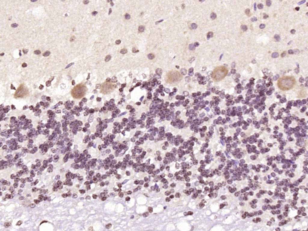 Paraformaldehyde-fixed, paraffin embedded (mouse cerebellum); Antigen retrieval by boiling in sodium citrate buffer (pH6.0) for 15min; Block endogenous peroxidase by 3% hydrogen peroxide for 20 minutes; Blocking buffer (normal goat serum) at 37°C for 30min; Antibody incubation with (PKC delta) Polyclonal Antibody, Unconjugated (bs-3625R) at 1:200 overnight at 4°C, followed by operating according to SP Kit(Rabbit) (sp-0023) instructionsand DAB staining.