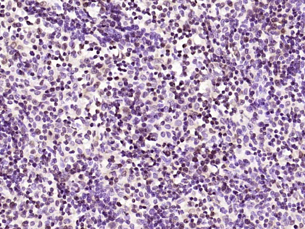Paraformaldehyde-fixed, paraffin embedded (rat lymphoid); Antigen retrieval by boiling in sodium citrate buffer (pH6.0) for 15min; Block endogenous peroxidase by 3% hydrogen peroxide for 20 minutes; Blocking buffer (normal goat serum) at 37°C for 30min; Antibody incubation with (phospho-PKC delta (Tyr52)) Polyclonal Antibody, Unconjugated (bs-3728R) at 1:200 overnight at 4°C, followed by operating according to SP Kit(Rabbit) (sp-0023) instructionsand DAB staining.