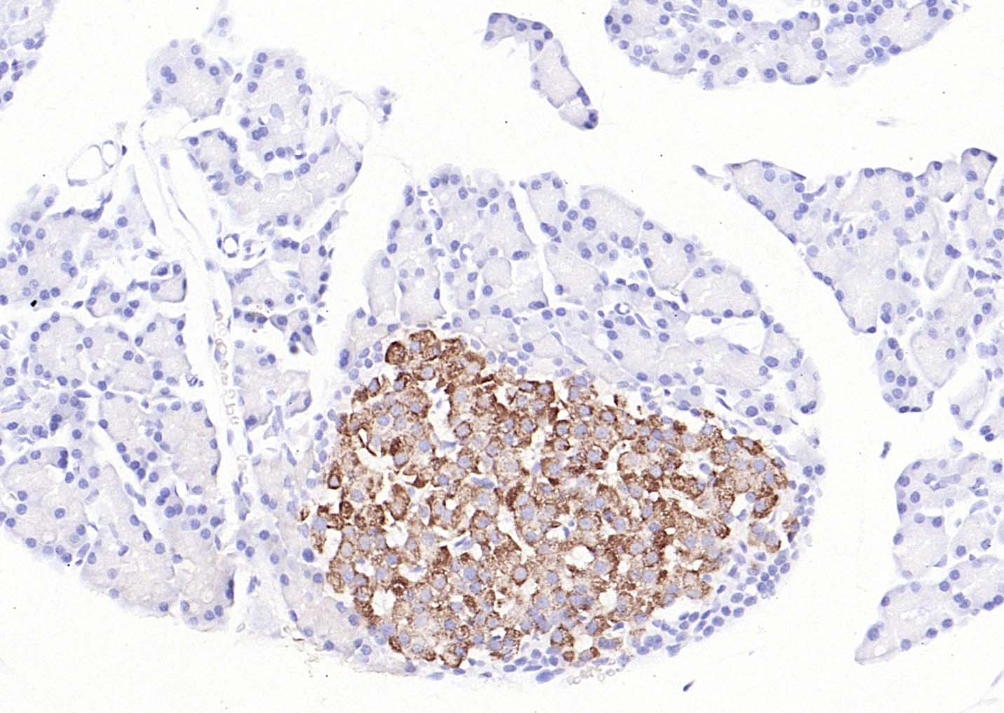 Paraformaldehyde-fixed, paraffin embedded (mouse pancreas); Antigen retrieval by boiling in sodium citrate buffer (pH6.0) for 15min; Block endogenous peroxidase by 3% hydrogen peroxide for 20 minutes; Blocking buffer (normal goat serum) at 37°C for 30min; Antibody incubation with (BMP8b) Polyclonal Antibody, Unconjugated (bs-3670R) at 1:200 overnight at 4°C, followed by operating according to SP Kit(Rabbit) (sp-0023) instructionsand DAB staining.