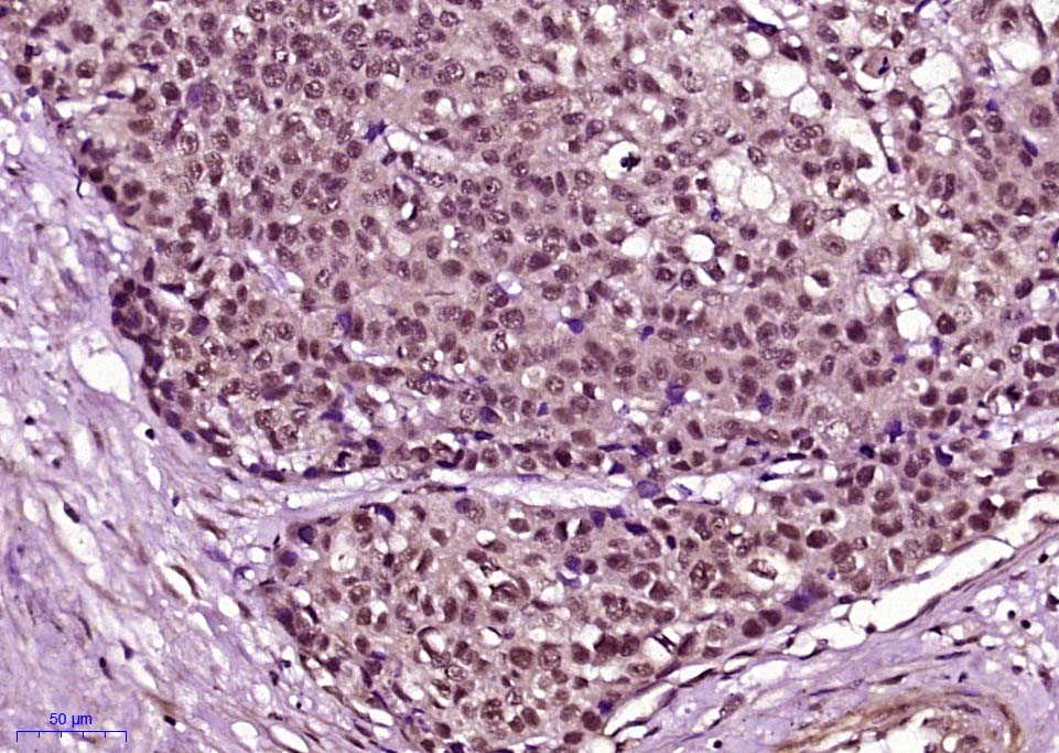 Paraformaldehyde-fixed, paraffin embedded (human skin cancer); Antigen retrieval by boiling in sodium citrate buffer (pH6.0) for 15min; Block endogenous peroxidase by 3% hydrogen peroxide for 20 minutes; Blocking buffer (normal goat serum) at 37°C for 30min; Antibody incubation with (Phospho-Cyclin B1 (Ser126)) Polyclonal Antibody, Unconjugated (bs-3733R) at 1:200 overnight at 4°C, followed by operating according to SP Kit(Rabbit) (sp-0023) instructionsand DAB staining.