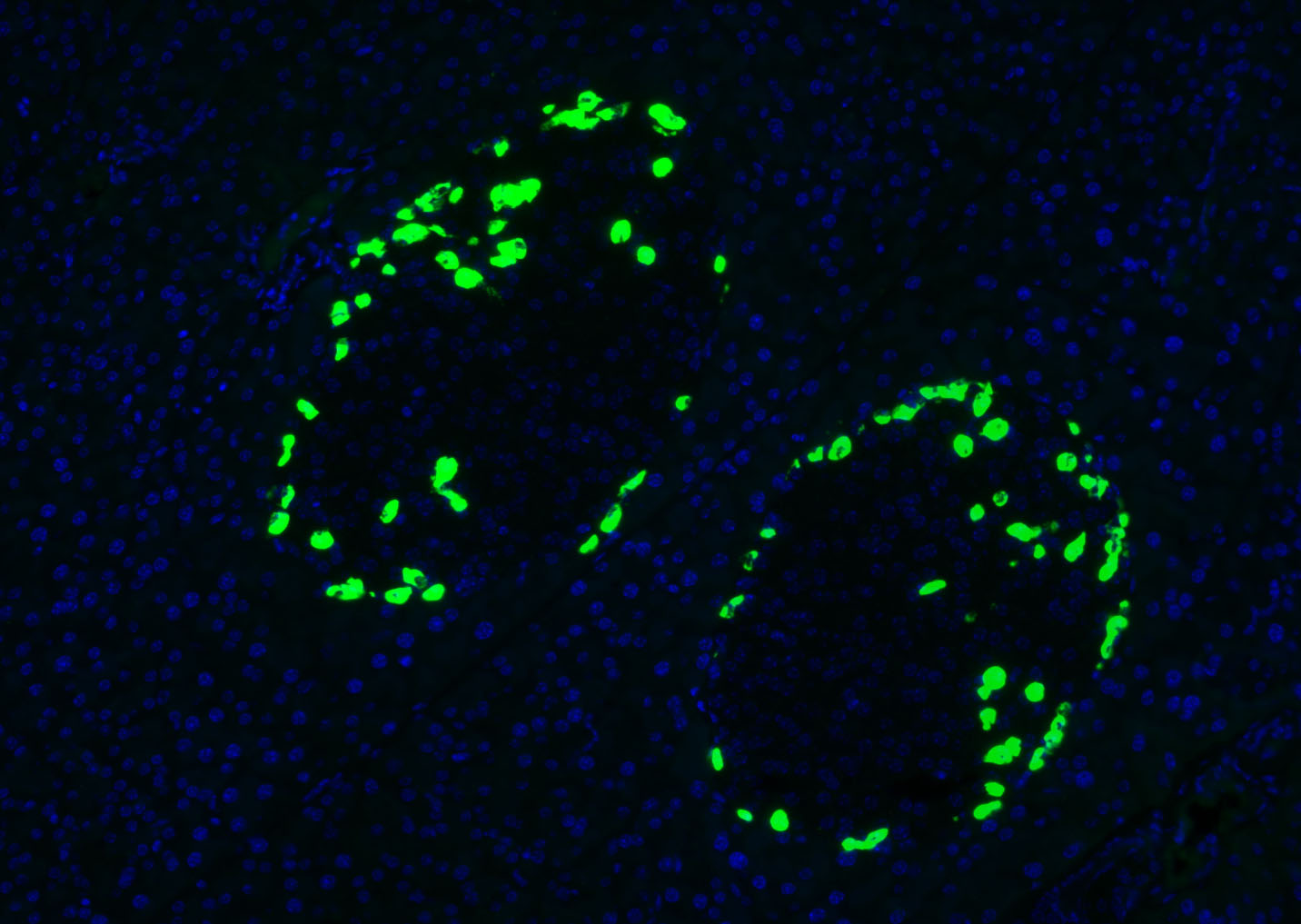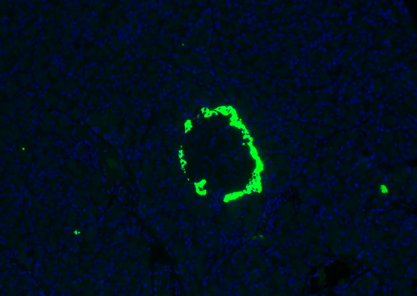 Paraformaldehyde-fixed, paraffin embedded (mouse pancreas); Antigen retrieval by boiling in sodium citrate buffer (pH6.0) for 15min; Blocking buffer (normal goat serum) at 37°C for 30min; Antibody incubation with (Glucagon) Polyclonal Antibody, Unconjugated (bs-3796R) at 1:500 overnight at 4°C, followed by a conjugated Goat Anti-Rabbit IgG antibody (YF488) for 90 minutes, and DAPI for nuclei staining.
