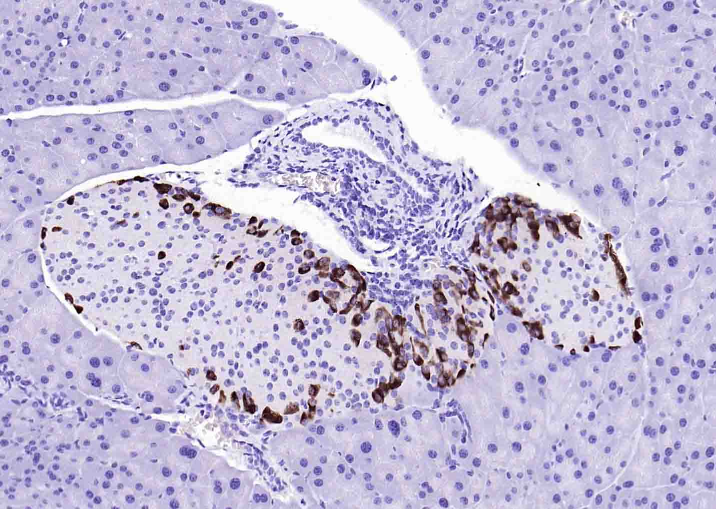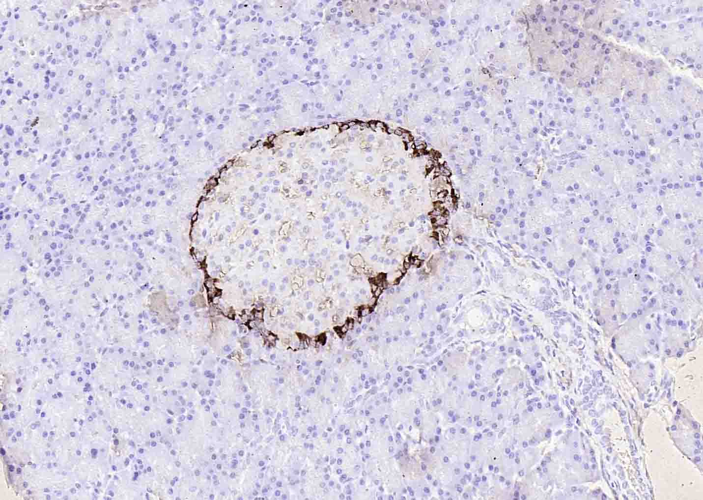 Paraformaldehyde-fixed, paraffin embedded (mouse pancreas); Antigen retrieval by boiling in sodium citrate buffer (pH6.0) for 15min; Block endogenous peroxidase by 3% hydrogen peroxide for 20 minutes; Blocking buffer (normal goat serum) at 37°C for 30min; Antibody incubation with (Glucagon) Polyclonal Antibody, Unconjugated (bs-3796R) at 1:200 overnight at 4°C, followed by operating according to SP Kit(Rabbit) (sp-0023) instructionsand DAB staining.
