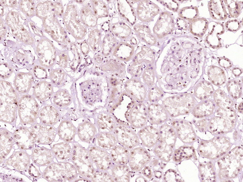 Paraformaldehyde-fixed, paraffin embedded (Human kidney); Antigen retrieval by boiling in sodium citrate buffer (pH6.0) for 15min; Block endogenous peroxidase by 3% hydrogen peroxide for 20 minutes; Blocking buffer (normal goat serum) at 37°C for 30min; Antibody incubation with (KDM1/LSD1) Polyclonal Antibody, Unconjugated (bs-3821R) at 1:400 overnight at 4°C, followed by operating according to SP Kit(Rabbit) (sp-0023) instructionsand DAB staining.