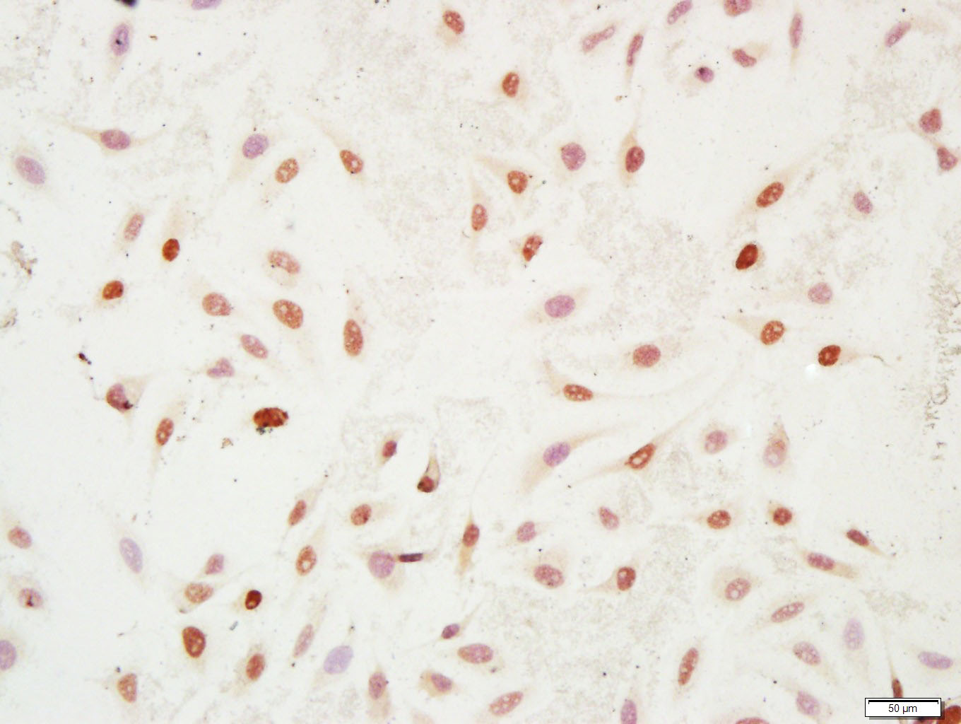 Tissue/cell: HeLa cell; 4% Paraformaldehyde-fixed; Triton X-100 at room temperature for 20 min; Block endogenous peroxidase by 3% hydrogen peroxide for 20 minutes; Blocking buffer (normal goat serum) at 37°C for 30min; Antibody incubation with (Histone H4 (Acetyl K12)) Polyclonal Antibody, Unconjugated (bs-3746R) at 1:400 overnight at 4°C, followed by operating according to SP Kit(Rabbit) (sp-0023) instructionsand DAB staining.