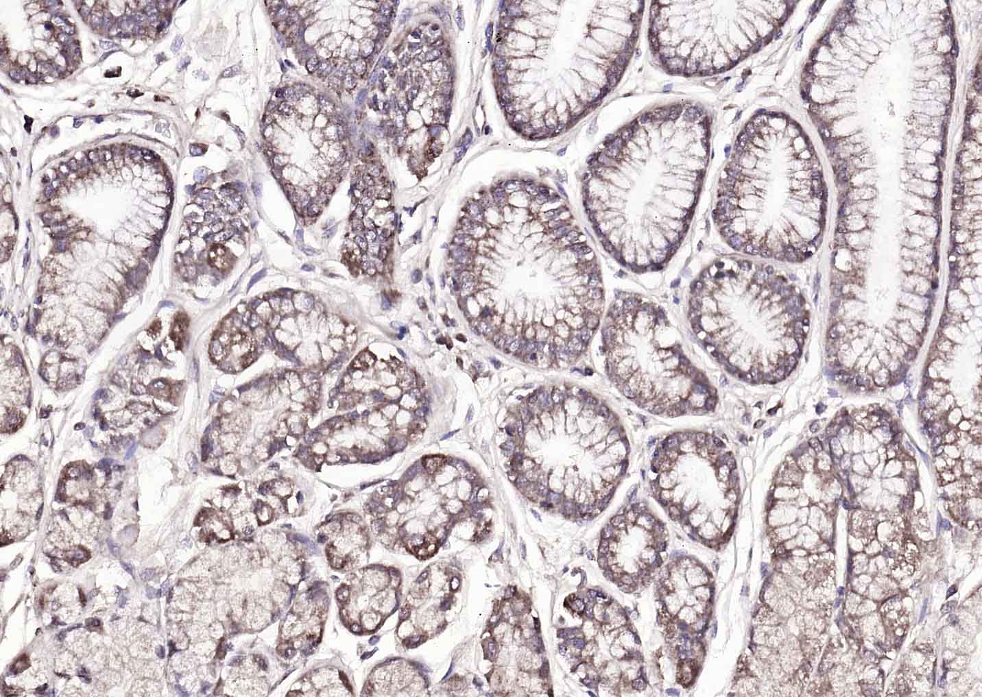 Paraformaldehyde-fixed, paraffin embedded (human gastric carcinoma); Antigen retrieval by boiling in sodium citrate buffer (pH6.0) for 15min; Block endogenous peroxidase by 3% hydrogen peroxide for 20 minutes; Blocking buffer (normal goat serum) at 37°C for 30min; Antibody incubation with (Amphiregulin) Polyclonal Antibody, Unconjugated (bs-3847R) at 1:200 overnight at 4°C, followed by operating according to SP Kit(Rabbit) (sp-0023) instructions and DAB staining.