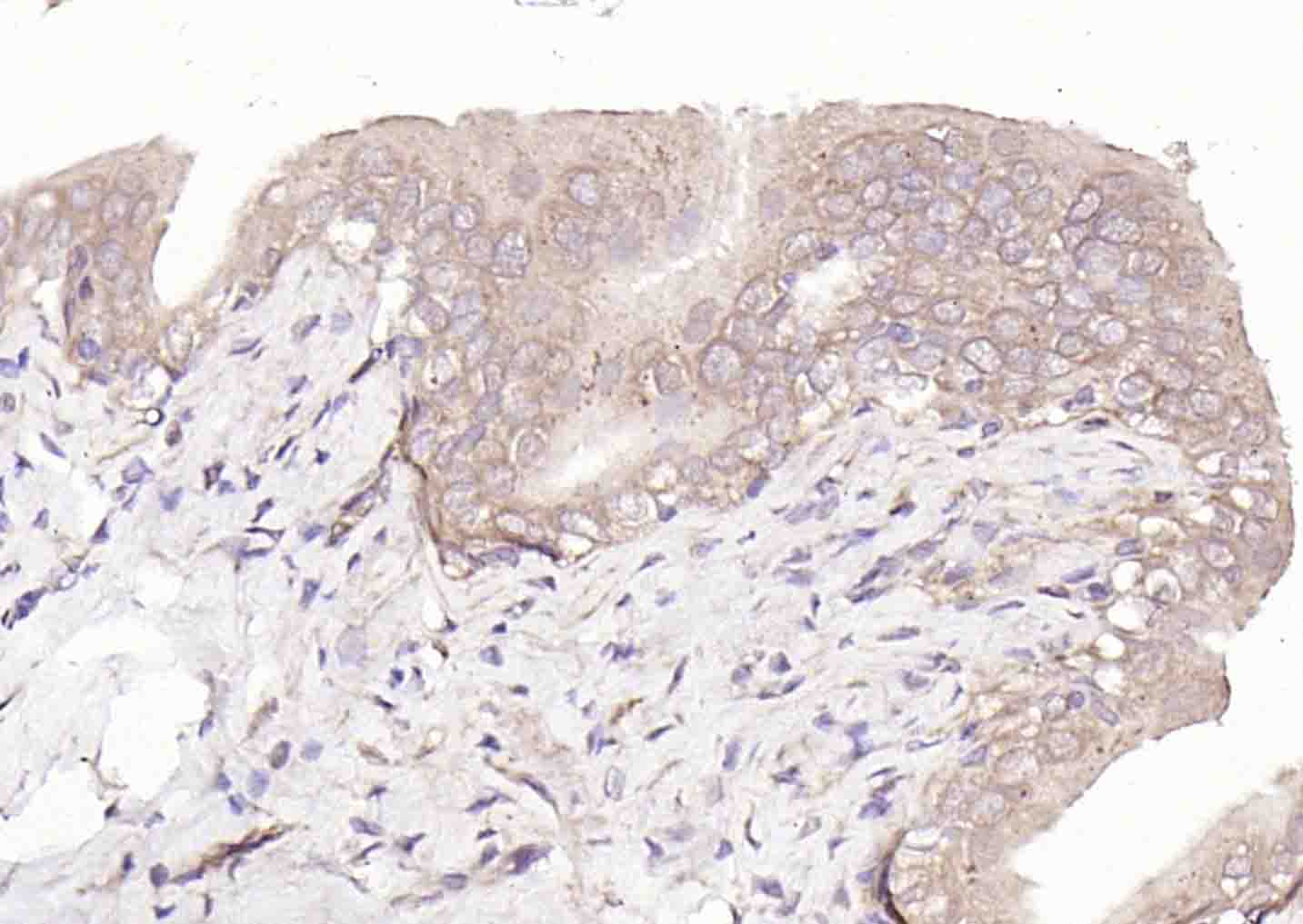 Paraformaldehyde-fixed, paraffin embedded (rat bladder); Antigen retrieval by boiling in sodium citrate buffer (pH6.0) for 15min; Block endogenous peroxidase by 3% hydrogen peroxide for 20 minutes; Blocking buffer (normal goat serum) at 37°C for 30min; Incubation with (CYP24A1) Polyclonal Antibody, Unconjugated (bs-3899R) at 1:200 overnight at 4°C, followed by operating according to SP Kit(Rabbit) (sp-0023) instructionsand DAB staining.