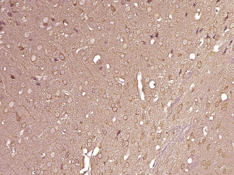 Paraformaldehyde-fixed, paraffin embedded (Rat brain); Antigen retrieval by boiling in sodium citrate buffer (pH6.0) for 15min; Block endogenous peroxidase by 3% hydrogen peroxide for 20 minutes; Blocking buffer (normal goat serum) at 37°C for 30min; Antibody incubation with (14-3-3 epsilon) Polyclonal Antibody, Unconjugated (bs-2340R) at 1:400 overnight at 4°C, followed by operating according to SP Kit(Rabbit) (sp-0023) instructionsand DAB staining.