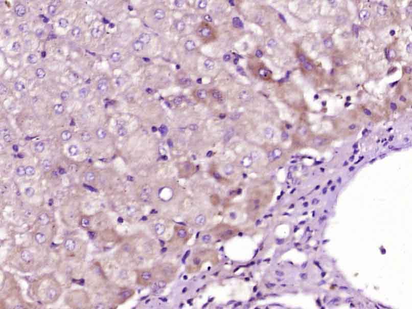 Paraformaldehyde-fixed, paraffin embedded (Human liver carcinoma); Antigen retrieval by boiling in sodium citrate buffer (pH6.0) for 15min; Block endogenous peroxidase by 3% hydrogen peroxide for 20 minutes; Blocking buffer (normal goat serum) at 37°C for 30min; Antibody incubation with (ATG5) Polyclonal Antibody, Unconjugated (bs-4005R) at 1:400 overnight at 4°C, followed by operating according to SP Kit(Rabbit) (sp-0023) instructionsand DAB staining.