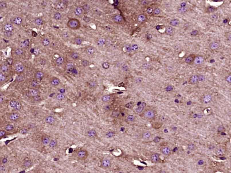 Paraformaldehyde-fixed, paraffin embedded (Mouse brain); Antigen retrieval by boiling in sodium citrate buffer (pH6.0) for 15min; Block endogenous peroxidase by 3% hydrogen peroxide for 20 minutes; Blocking buffer (normal goat serum) at 37°C for 30min; Antibody incubation with (ATG5) Polyclonal Antibody, Unconjugated (bs-4005R) at 1:400 overnight at 4°C, followed by operating according to SP Kit(Rabbit) (sp-0023) instructionsand DAB staining.