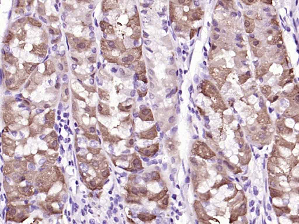 Paraformaldehyde-fixed, paraffin embedded (human gastric); Antigen retrieval by boiling in sodium citrate buffer (pH6.0) for 15min; Block endogenous peroxidase by 3% hydrogen peroxide for 20 minutes; Blocking buffer (normal goat serum) at 37°C for 30min; Antibody incubation with (ATG5) Polyclonal Antibody, Unconjugated (bs-4005R) at 1:200 overnight at 4°C, followed by operating according to SP Kit(Rabbit) (sp-0023) instructionsand DAB staining.