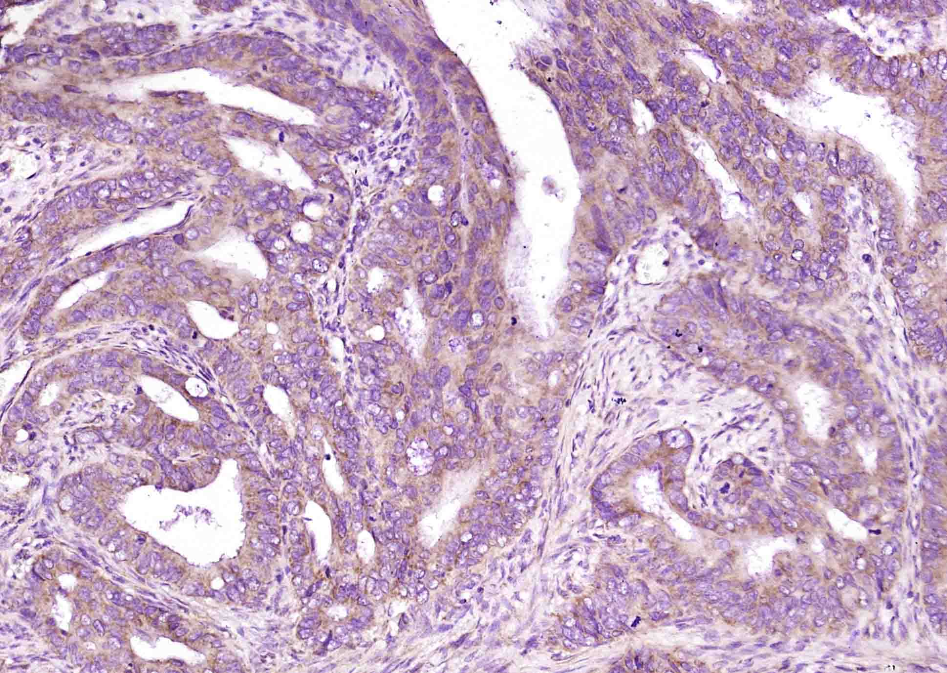 Paraformaldehyde-fixed, paraffin embedded (human colon carcinoma); Antigen retrieval by boiling in sodium citrate buffer (pH6.0) for 15min; Block endogenous peroxidase by 3% hydrogen peroxide for 20 minutes; Blocking buffer (normal goat serum) at 37°C for 30min; Antibody incubation with (CD4) Polyclonal Antibody, Unconjugated (bs-0647R) at 1:4000 overnight at 4°C, followed by operating according to SP Kit(Rabbit) (sp-0023) instructionsand DAB staining.