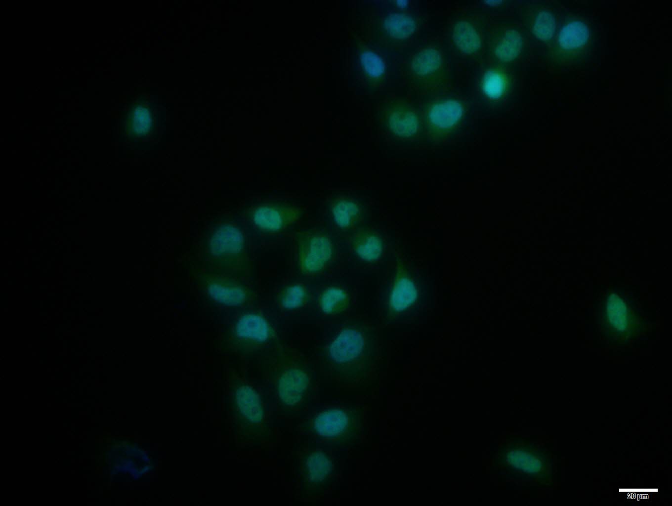 Hela cell; 4% Paraformaldehyde-fixed; Triton X-100 at room temperature for 20 min; Blocking buffer (normal goat serum, C-0005) at 37°C for 20 min; Antibody incubation with (Histone H4 (Acetyl K8)) polyclonal Antibody, Unconjugated (bs-4016R) 1:100, 90 minutes at 37°C; followed by a conjugated Goat Anti-Rabbit IgG antibody at 37°C for 90 minutes, DAPI (blue, C02-04002) was used to stain the cell nuclei.
