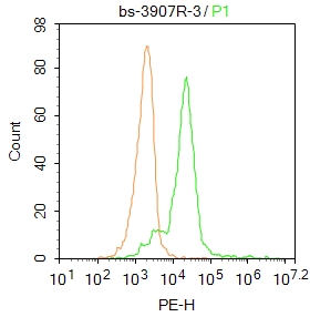 Overlay histogram showing Mouse spleen cells stained with bs-3907-PE (red line). The cells were fixed with 1% paraformaldehyde (10 min).The cells were then incubated with the antibody (bs-3907R-PE, 2ug/1x106cells) for 30 min at 22-25℃. Isotype control antibody (black line) was rabbit IgG (2ug/1x106cells) used under the same conditions. Acquisition of events were used for analysis.