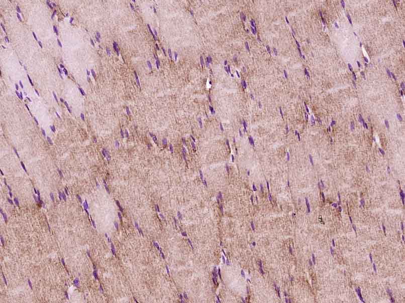 Paraformaldehyde-fixed, paraffin embedded (Rat skeletal muscle); Antigen retrieval by boiling in sodium citrate buffer (pH6.0) for 15min; Block endogenous peroxidase by 3% hydrogen peroxide for 20 minutes; Blocking buffer (normal goat serum) at 37°C for 30min; Antibody incubation with (PER2) Polyclonal Antibody, Unconjugated (bs-3927R) at 1:400 overnight at 4°C, followed by operating according to SP Kit(Rabbit) (sp-0023) instructionsand DAB staining.