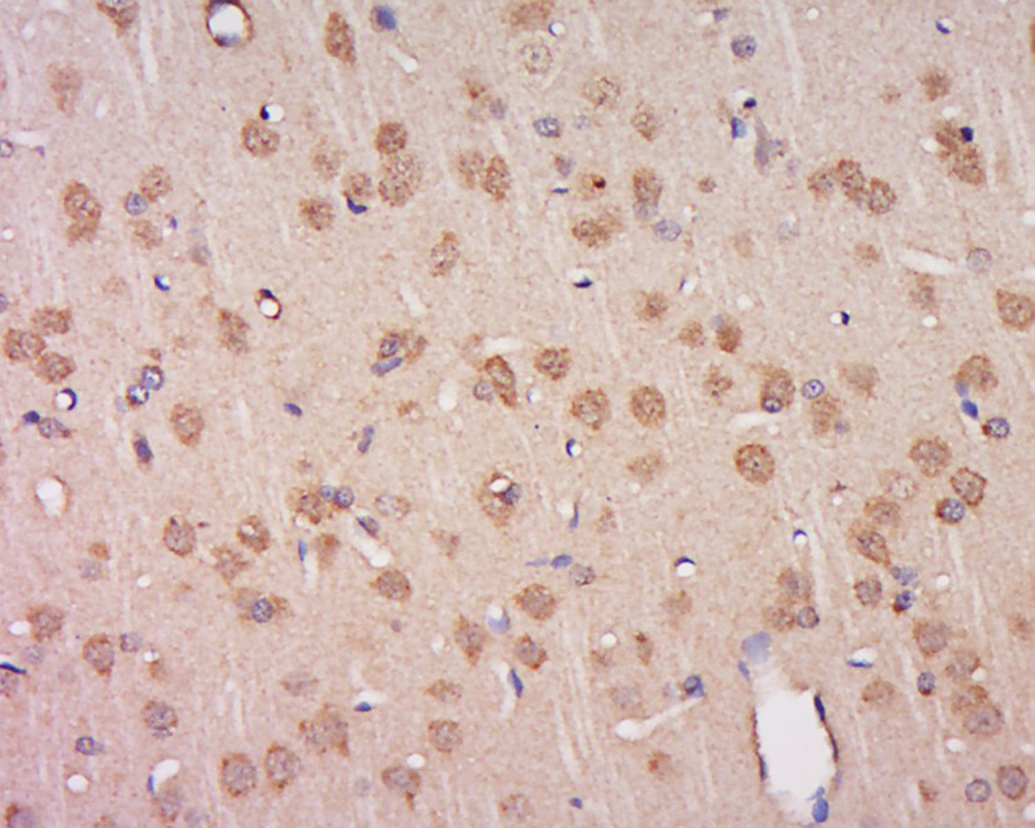Paraformaldehyde-fixed, paraffin embedded (Mouse brain); Antigen retrieval by boiling in sodium citrate buffer (pH6.0) for 15min; Block endogenous peroxidase by 3% hydrogen peroxide for 20 minutes; Blocking buffer (normal goat serum) at 37°C for 30min; Antibody incubation with (PFKFB2) Polyclonal Antibody, Unconjugated (bs-5005R) at 1:400 overnight at 4°C, followed by operating according to SP Kit(Rabbit) (sp-0023) instructionsand DAB staining.