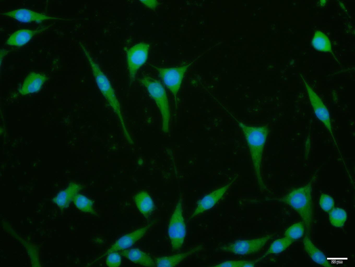 NIH/3T3 cell; 4% Paraformaldehyde-fixed; Triton X-100 at room temperature for 20 min; Blocking buffer (normal goat serum, C-0005) at 37°C for 20 min; Antibody incubation with (Hsc70) polyclonal Antibody, Unconjugated (bs-5117R) 1:100, 90 minutes at 37°C; followed by a conjugated Goat Anti-Rabbit IgG antibody at 37°C for 90 minutes, DAPI (blue, C02-04002) was used to stain the cell nuclei.
