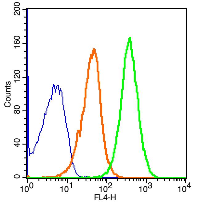 Blank control(blue): U-87MG Cells(fixed with 2% paraformaldehyde (10 min)). Primary Antibody: Rabbit Anti-CD21/AF647 Conjugated antibody (bs-3792R/AF647), Dilution: 1μg in 100 μL 1X PBS containing 0.5% BSA; Isotype Control Antibody: Rabbit IgG/AF647(orange) ,used under the same conditions.