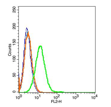 Blank control: Raji cells(blue). Primary Antibody:Rabbit Anti- CD21 antibody(bs-3792R), Dilution: 1μg in 100 1μL 1X PBS containing 0.5% BSA; Isotype Control Antibody: Rabbit IgG(orange) ,used under the same conditions ); Secondary Antibody: Goat anti-rabbit IgG-PE(white blue), Dilution: 1:200 in 1 X PBS containing 0.5% BSA.