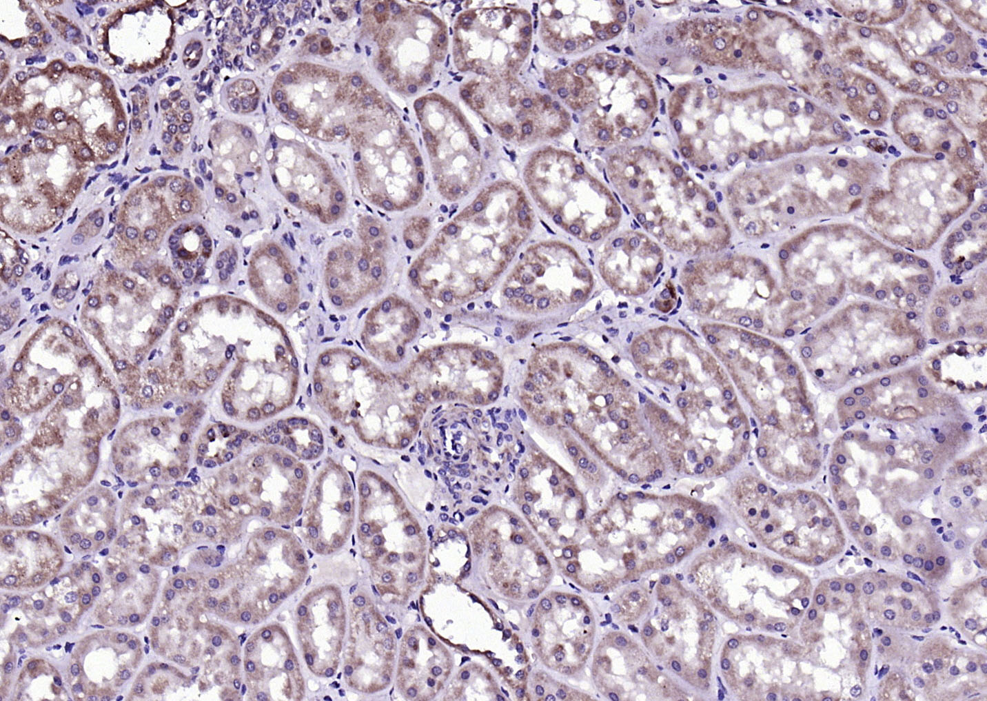 Paraformaldehyde-fixed, paraffin embedded (Human kidney); Antigen retrieval by boiling in sodium citrate buffer (pH6.0) for 15min; Block endogenous peroxidase by 3% hydrogen peroxide for 20 minutes; Blocking buffer (normal goat serum) at 37°C for 30min; Antibody incubation with (Phospho-Bad (Ser118)) Polyclonal Antibody, Unconjugated (bs-5216R) at 1:200 overnight at 4°C, followed by operating according to SP Kit(Rabbit) (sp-0023) instructionsand DAB staining.