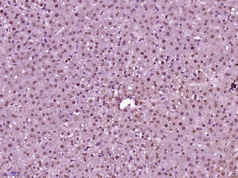 Paraformaldehyde-fixed, paraffin embedded (Rat liver); Antigen retrieval by boiling in sodium citrate buffer (pH6.0) for 15min; Block endogenous peroxidase by 3% hydrogen peroxide for 20 minutes; Blocking buffer (normal goat serum) at 37°C for 30min; Antibody incubation with (phospho-CDKN1A (Thr145)) Polyclonal Antibody, Unconjugated (bs-5237R) at 1:400 overnight at 4°C, followed by operating according to SP Kit(Rabbit) (sp-0023) instructionsand DAB staining.