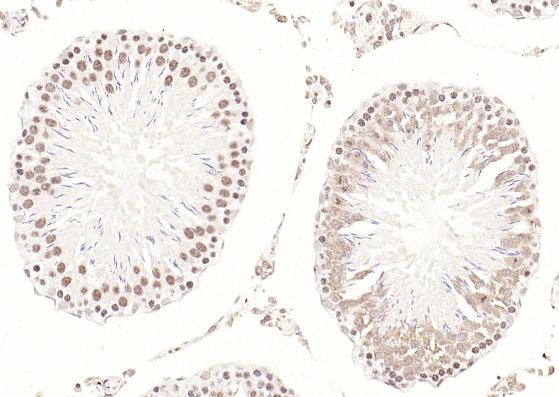 Paraformaldehyde-fixed, paraffin embedded (mouse testis); Antigen retrieval by boiling in sodium citrate buffer (pH6.0) for 15min; Block endogenous peroxidase by 3% hydrogen peroxide for 20 minutes; Blocking buffer (normal goat serum) at 37°C for 30min; Antibody incubation with (phospho-CDKN1Ap21 (Thr145)) Polyclonal Antibody, Unconjugated (bs-5237R) at 1:200 overnight at 4°C, followed by operating according to SP Kit(Rabbit) (sp-0023) instructionsand DAB staining.