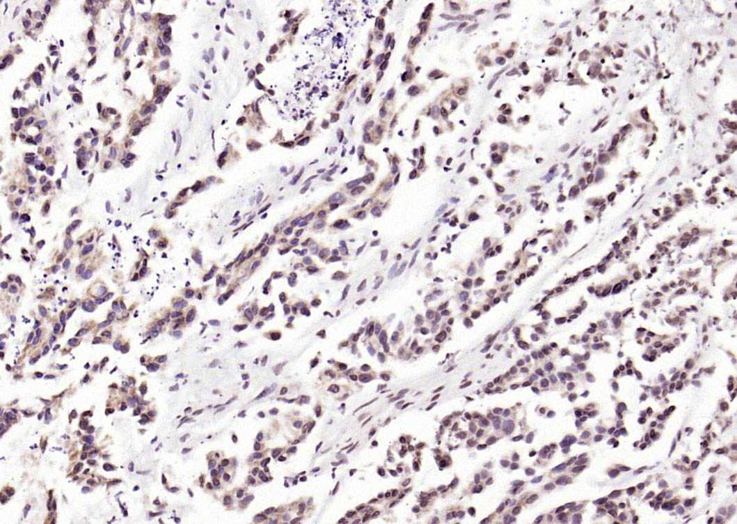 Paraformaldehyde-fixed, paraffin embedded (human colon carcinoma); Antigen retrieval by boiling in sodium citrate buffer (pH6.0) for 15min; Block endogenous peroxidase by 3% hydrogen peroxide for 20 minutes; Blocking buffer (normal goat serum) at 37°C for 30min; Antibody incubation with (phospho-CDKN1Ap21 (Thr145)) Polyclonal Antibody, Unconjugated (bs-5237R) at 1:200 overnight at 4°C, followed by operating according to SP Kit(Rabbit) (sp-0023) instructionsand DAB staining.