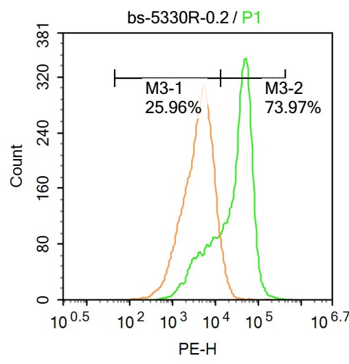 Molt-4 cells were fixed with 4% PFA for 10min at room temperature,permeabilized with 0.1% PBST for 20 min at room temperature, and incubated in 5% BSA blocking buffer for 30 min at room temperature. Cells were then stained with Phospho-RhoA Antibody(bs-5330R)at 1:100 dilution in blocking buffer and incubated for 30 min at room temperature, washed twice with 2%BSA in PBS, followed by secondary antibody incubation for 40 min at room temperature. Acquisitions of 20,000 events were performed. Cells stained with primary antibody (green), and isotype control (orange).