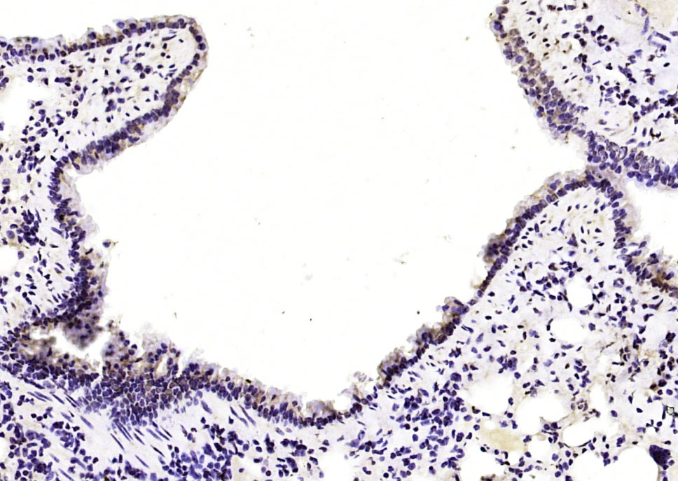 Paraformaldehyde-fixed, paraffin embedded (mouse lung tissue); Antigen retrieval by boiling in sodium citrate buffer (pH6.0) for 15min; Block endogenous peroxidase by 3% hydrogen peroxide for 20 minutes; Blocking buffer (normal goat serum) at 37°C for 30min; Antibody incubation with (CUEDC2) Polyclonal Antibody, Unconjugated (bs-4608R) at 1:200 overnight at 4°C, followed by operating according to SP Kit(Rabbit) (sp-0023) instructionsand DAB staining.