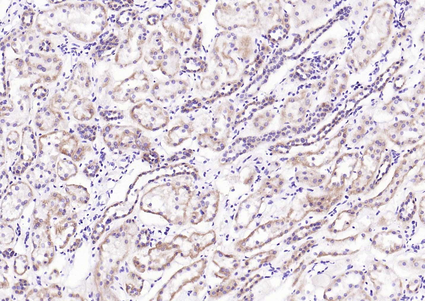 Paraformaldehyde-fixed, paraffin embedded (Human kidney); Antigen retrieval by boiling in sodium citrate buffer (pH6.0) for 15min; Block endogenous peroxidase by 3% hydrogen peroxide for 20 minutes; Blocking buffer (normal goat serum) at 37°C for 30min; Antibody incubation with (LRP5) Polyclonal Antibody, Unconjugated (bs-4117R) at 1:200 overnight at 4°C, followed by operating according to SP Kit(Rabbit) (sp-0023) instructionsand DAB staining.