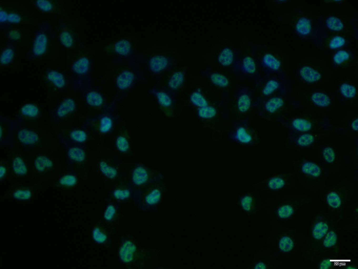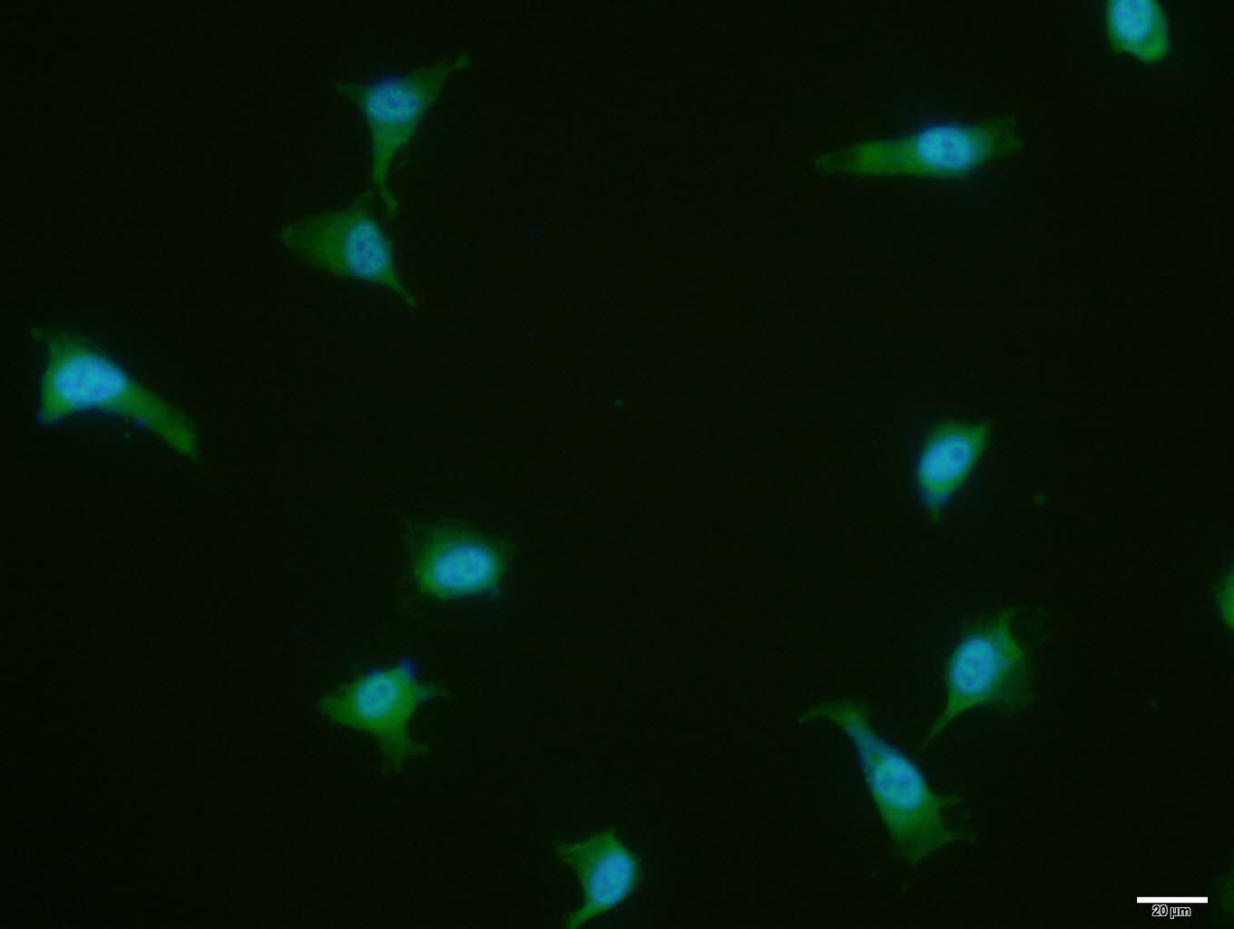 Hela cell; 4% Paraformaldehyde-fixed; Triton X-100 at room temperature for 20 min; Blocking buffer (normal goat serum, C-0005) at 37°C for 20 min; Antibody incubation with (PKM2) polyclonal Antibody, Unconjugated (bs-0102M) 1:100, 90 minutes at 37°C; followed by a conjugated Goat Anti-Mouse IgG antibody at 37°C for 90 minutes, DAPI (blue, C02-04002) was used to stain the cell nuclei.