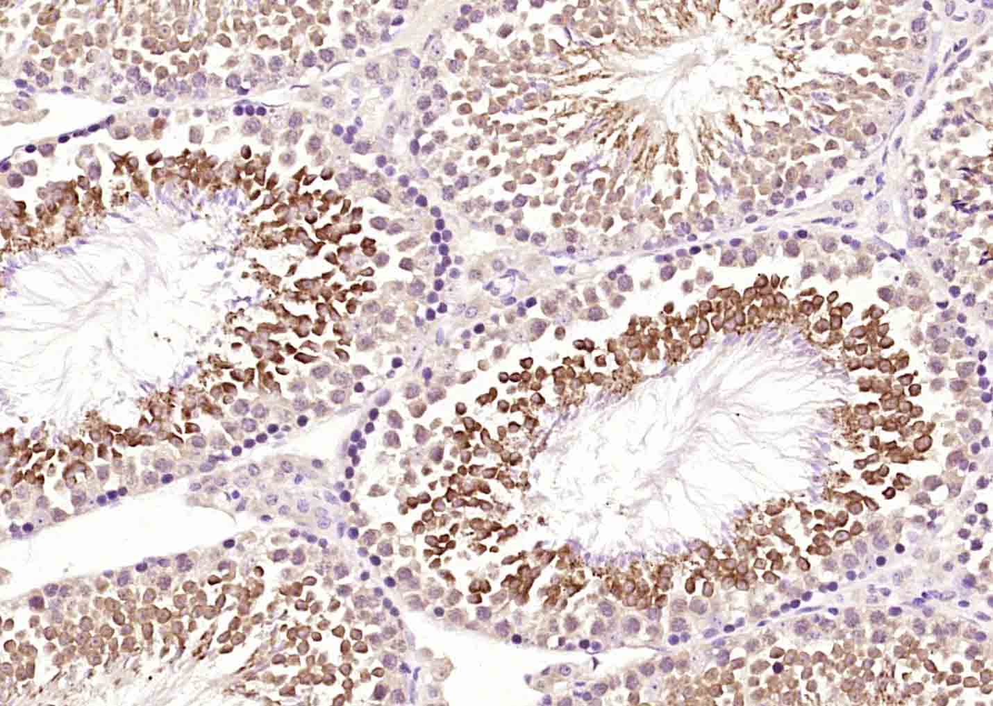 Paraformaldehyde-fixed, paraffin embedded (mouse testis); Antigen retrieval by boiling in sodium citrate buffer (pH6.0) for 15min; Block endogenous peroxidase by 3% hydrogen peroxide for 20 minutes; Blocking buffer (normal goat serum) at 37°C for 30min; Antibody incubation with (MEK5) Polyclonal Antibody, Unconjugated (bs-4124R) at 1:200 overnight at 4°C, followed by operating according to SP Kit(Rabbit) (sp-0023) instructionsand DAB staining.