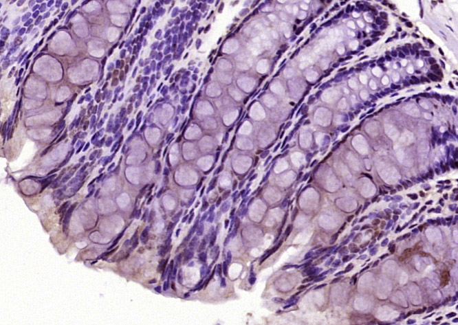 Paraformaldehyde-fixed, paraffin embedded (Mouse colon); Antigen retrieval by boiling in sodium citrate buffer (pH6.0) for 15min; Block endogenous peroxidase by 3% hydrogen peroxide for 20 minutes; Blocking buffer (normal goat serum) at 37°C for 30min; Antibody incubation with (phospho-MAPK8 ( Thr183 + Tyr185)) Polyclonal Antibody, Unconjugated (bs-5487R) at 1:400 overnight at 4°C, followed by operating according to SP Kit(Rabbit) (sp-0023) instructionsand DAB staining.