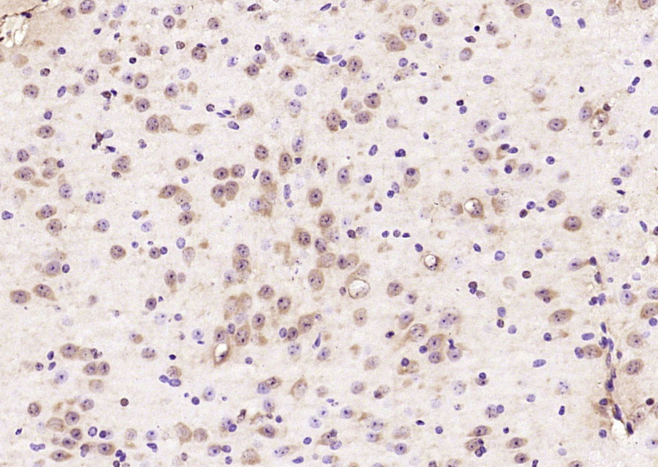Paraformaldehyde-fixed, paraffin embedded (rat brain); Antigen retrieval by boiling in sodium citrate buffer (pH6.0) for 15min; Block endogenous peroxidase by 3% hydrogen peroxide for 20 minutes; Blocking buffer (normal goat serum) at 37°C for 30min; Antibody incubation with (Phospho-MARCKS (Ser170)) Polyclonal Antibody, Unconjugated (bs-5500R) at 1:200 overnight at 4°C, followed by operating according to SP Kit(Rabbit) (sp-0023) instructionsand DAB staining.