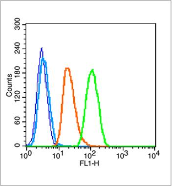 Secondary Antibody (white blue line): Goat anti-rabbit IgG-FITC,Dilution: 1μg /test.