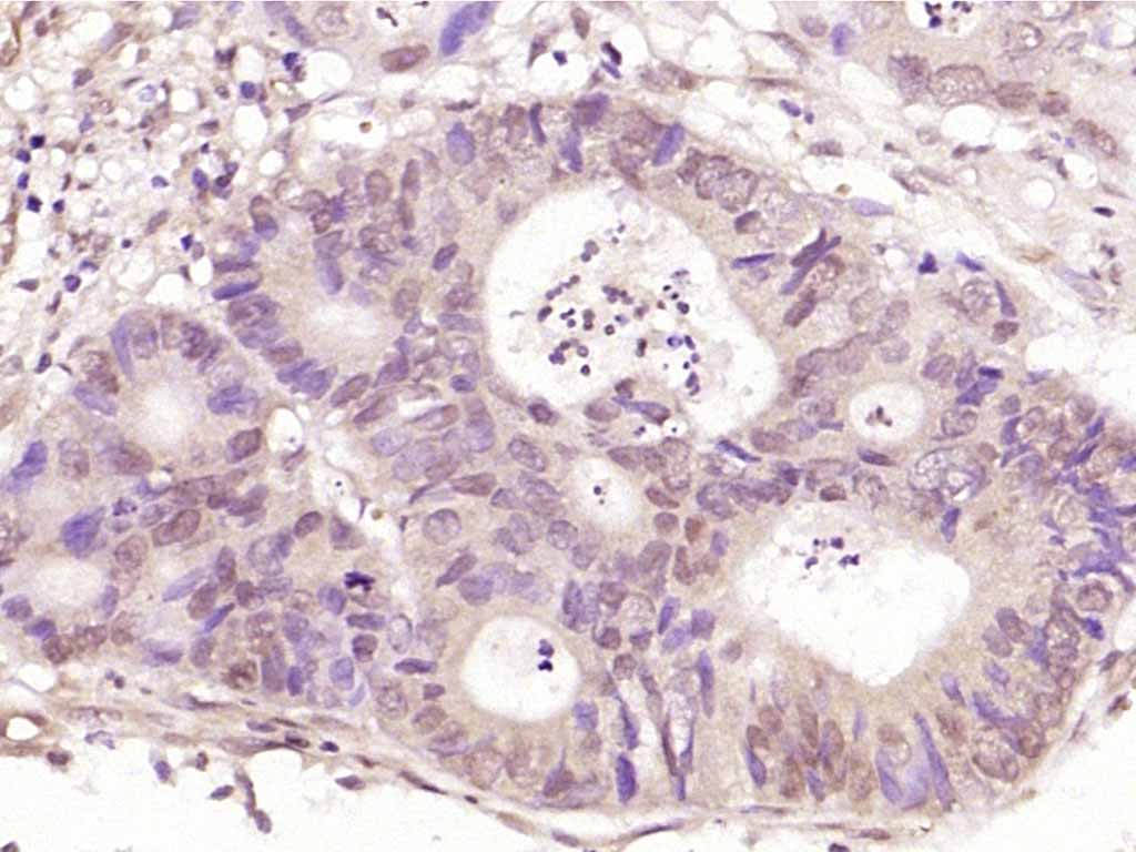 Paraformaldehyde-fixed, paraffin embedded (human rectal carcinoma); Antigen retrieval by boiling in sodium citrate buffer (pH6.0) for 15min; Block endogenous peroxidase by 3% hydrogen peroxide for 20 minutes; Blocking buffer (normal goat serum) at 37°C for 30min; Antibody incubation with (Phospho-NFKB1 (Ser903)) Polyclonal Antibody, Unconjugated (bs-5509R) at 1:200 overnight at 4°C, followed by operating according to SP Kit(Rabbit) (sp-0023) instructionsand DAB staining.
