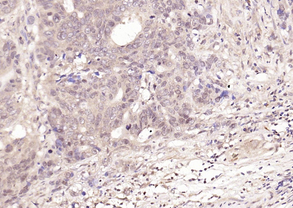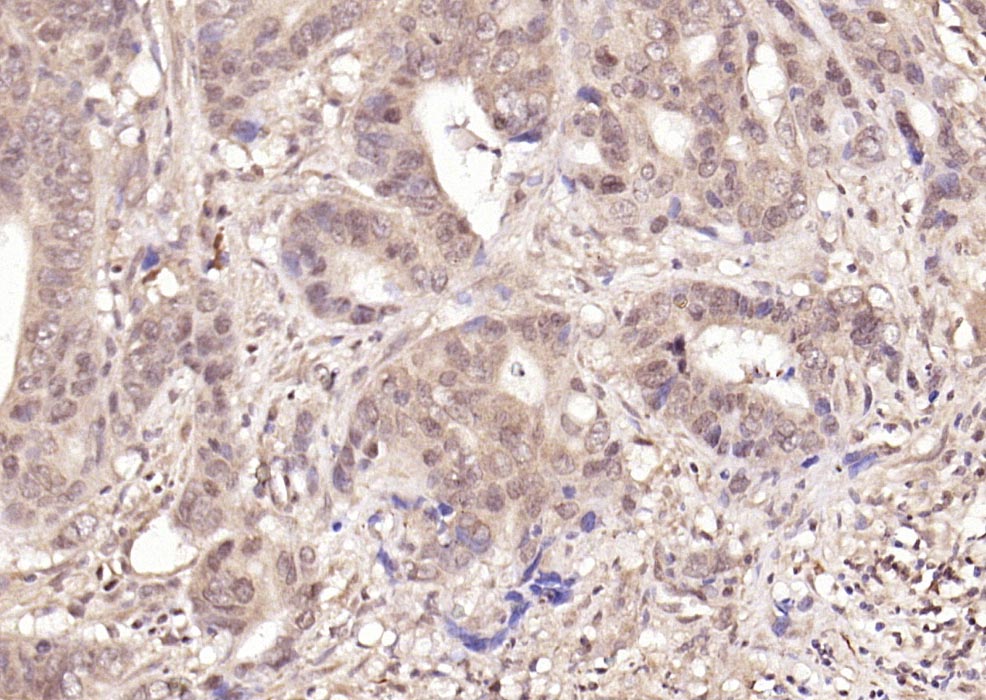 Paraformaldehyde-fixed, paraffin embedded (human rectal carcinoma); Antigen retrieval by boiling in sodium citrate buffer (pH6.0) for 15min; Block endogenous peroxidase by 3% hydrogen peroxide for 20 minutes; Blocking buffer (normal goat serum) at 37°C for 30min; Antibody incubation with (Phospho-NFKB1 (Ser337)) Polyclonal Antibody, Unconjugated (bs-5512R) at 1:200 overnight at 4°C, followed by operating according to SP Kit(Rabbit) (sp-0023) instructionsand DAB staining.