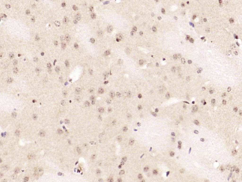 Paraformaldehyde-fixed, paraffin embedded (Mouse brain); Antigen retrieval by boiling in sodium citrate buffer (pH6.0) for 15min; Block endogenous peroxidase by 3% hydrogen peroxide for 20 minutes; Blocking buffer (normal goat serum) at 37°C for 30min; Antibody incubation with (Phospho-NFKB1 (Ser337)) Polyclonal Antibody, Unconjugated (bs-5512R) at 1:400 overnight at 4°C, followed by operating according to SP Kit(Rabbit) (sp-0023) instructionsand DAB staining.