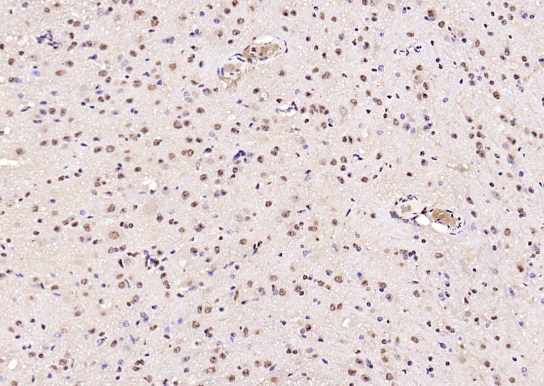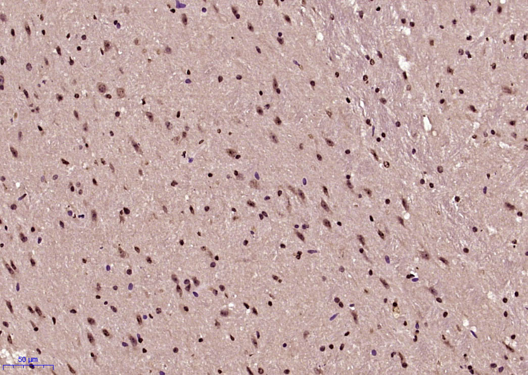 Paraformaldehyde-fixed, paraffin embedded (Mouse brain); Antigen retrieval by boiling in sodium citrate buffer (pH6.0) for 15min; Block endogenous peroxidase by 3% hydrogen peroxide for 20 minutes; Blocking buffer (normal goat serum) at 37°C for 30min; Antibody incubation with (Phospho-NFKB1 (Ser893)) Polyclonal Antibody, Unconjugated (bs-5513R) at 1:400 overnight at 4°C, followed by operating according to SP Kit(Rabbit) (sp-0023) instructionsand DAB staining.